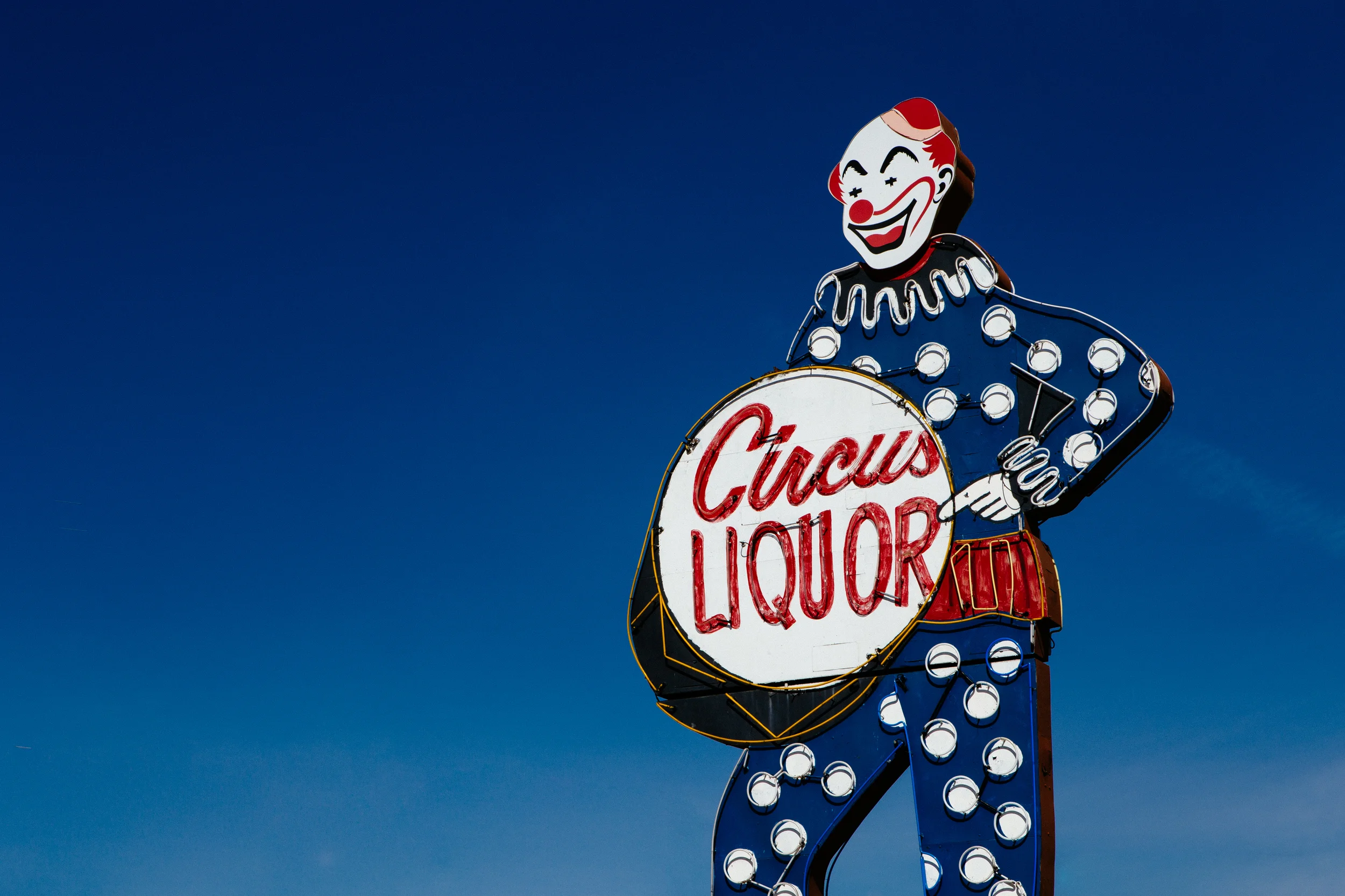 A neon sign depicting a smiling clown dressed in a blue polka-dotted costume with a red bow tie, holding a sign that reads 'Circus Liquor', against a clear blue sky. View fullsize